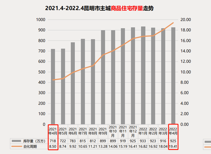 根據(jù)克而瑞公布的4月樓市成交數(shù)據(jù),昆明商品住宅庫(kù)存總量達(dá)到了925萬(wàn)方,按照4月份銷售30.32萬(wàn)方的去化速度,需要19.41個(gè)月才能消化完。