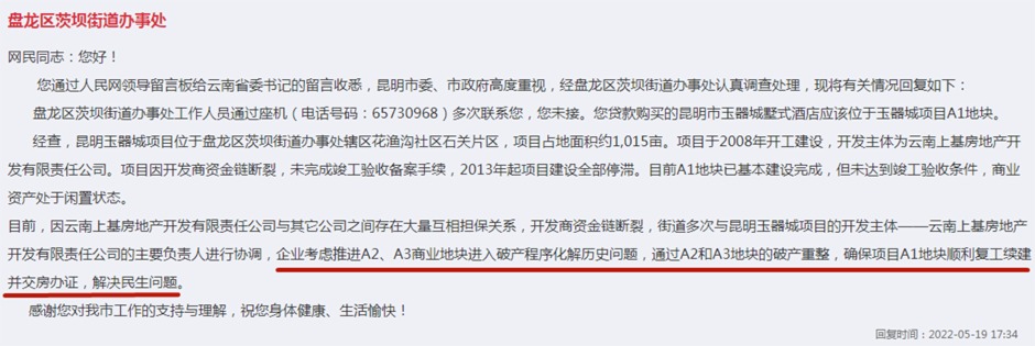回復稱,因開發商與其他公司之間存在大量的互相擔保關系,導致開發商資金鏈斷裂,工程爛尾。經街道辦多次與開發主體的負責人進行協調,目前,開發商考慮推進A2、A3商業地塊進入破產重整程序,以期化解歷史問題,并通過A2和A3地塊的破產重整,確保項目A1地塊復工續建,達到交房辦證的目標。
