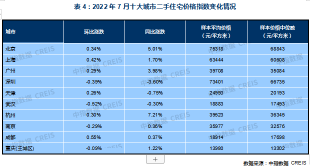 表2:2022年7月十大城市新建住宅價(jià)格指數(shù)變化情況