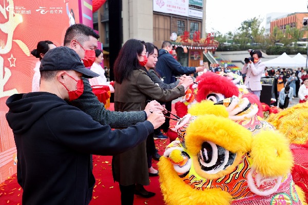 隨后,一陣超然的《瑞獅鳴潮》后,潤城集團董事朱青、云南融潤商業運營管理有限公司總經理周洪潔、昆明怡和物業服務有限公司總經理黃勇謙、潤城集團營銷部總經理張穩、潤城集團財務部總經理劉勇新、潤城集團品質部總經理鄭洪、昆明沅怡景觀工程有限公司總經理徐建平、潤城集團綜合部總經理楊雪等手握金筆,共同為雄獅點睛,長水航城云立方商業街區正式開業。由此,空港經濟區首個一站式商業體誕生,片區生活消費正提檔升級。