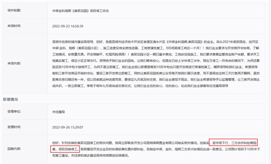 針對網友的問題,昆明市住建局回復稱,該項目因開發商合作糾紛導致停工,經過多次協調達成一致,預計在今年10月中下旬復工。