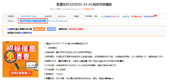 另值一提的是,就在10多天前,云南國(guó)貿(mào)陽光房地產(chǎn)開發(fā)有限公司曾經(jīng)發(fā)布過一份招標(biāo)公告,要對(duì)該宗地展開可研編制和強(qiáng)排方案設(shè)計(jì)等工作,時(shí)間點(diǎn)與此次上架時(shí)間相吻合,疑似對(duì)地塊表現(xiàn)出興趣。
