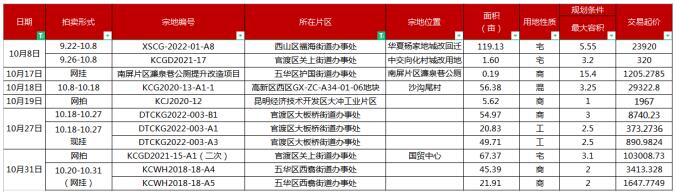 10月31日,官渡區關上街道辦事處及五華區西翥街道辦事處3宗土地計劃完成土地交易。