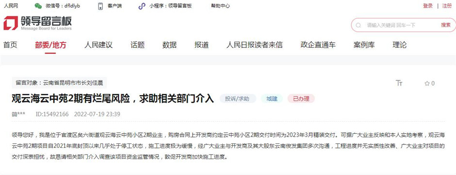 不過根據最近業主在領導留言板的反映,觀云海云中苑2期自2021年底封頂以來幾乎處于停工狀態,施工進度極為緩慢,存在爛尾的風險。