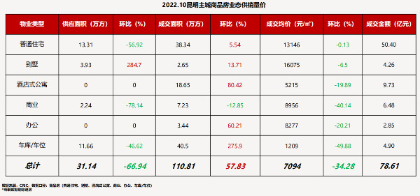 今日,克而瑞發(fā)布昆明10月樓市成交月報(bào)。單純從數(shù)字看,昆明10月商品房成交均價(jià)為7094元/平,環(huán)比下降34%;成交卻達(dá)到110.81萬(wàn)方,環(huán)比上漲57.83%。看似“以價(jià)換量”,但克而瑞分析,這主要是由于個(gè)別項(xiàng)目延遲備案影響,實(shí)際成交與9月基本持平。