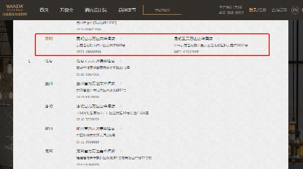 在萬達酒店官網上顯示昆明如今只有兩家萬達酒店