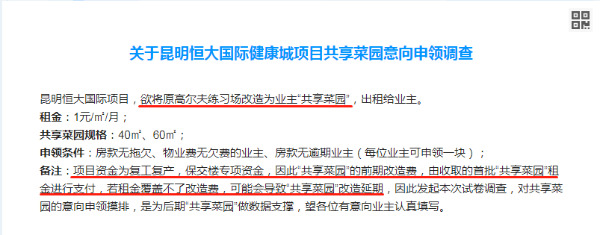 值得一提的是,意向申請問卷表中,恒大國際健康城物業透露了兩個關鍵信息。一是,菜園的改造資金來源為收取到的首批租金,如果租金覆蓋不了改造費,那么可能會有延期風險;另一個是,“共享菜園”的改造地點是原高爾夫練習場。