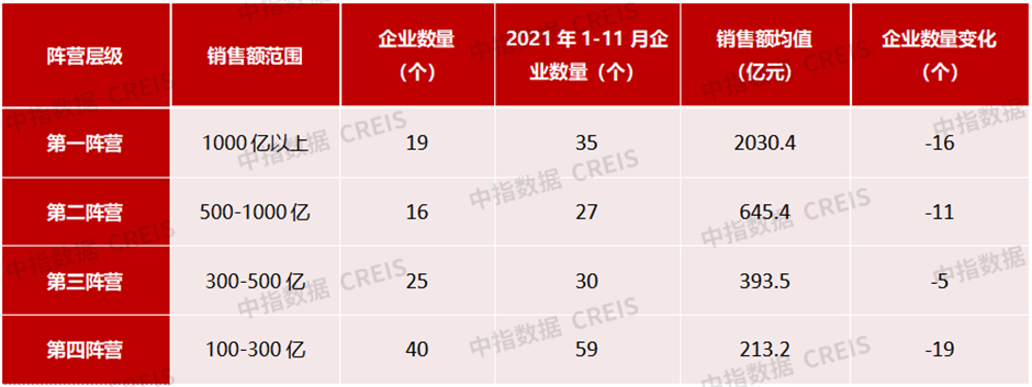 表:2022年1-11月房企各陣營數量及銷售額均值情況