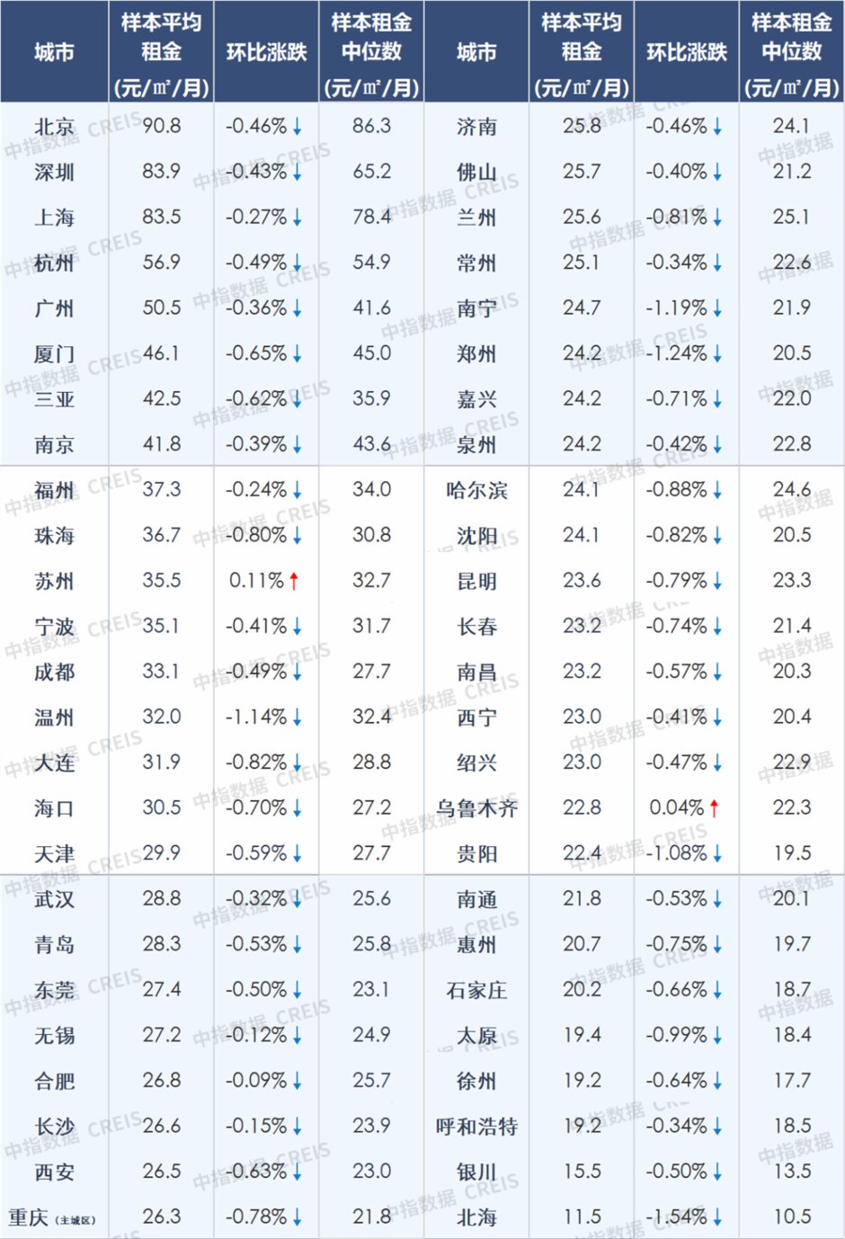 2022年11月,全國50個城市住宅平均租金為36.9元/平方米/月,環比下跌0.49%,同比下跌3.09%。