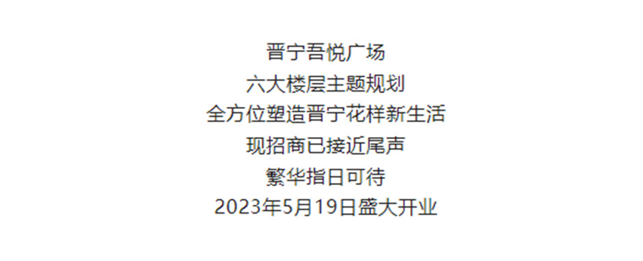 根據(jù)昆明晉寧吾悅廣場官微發(fā)布,延期兩次開業(yè)的晉寧吾悅廣場將于2023年5月19日盛大開業(yè)。