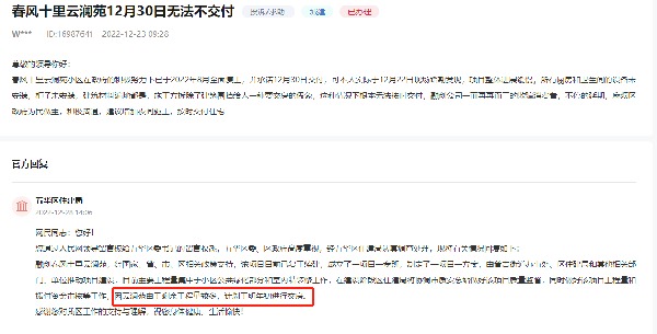 近日,有網(wǎng)友在人民網(wǎng)地方領(lǐng)導(dǎo)留言板反映,融創(chuàng)春風(fēng)十里云瀾苑承諾12月30日交付,但根據(jù)現(xiàn)場(chǎng)施工情況根本無(wú)法做到按時(shí)交付。五華區(qū)住建局在12月28日的回復(fù)中提到,因云瀾苑剩余工程量較多,計(jì)劃于明年初進(jìn)行交房。