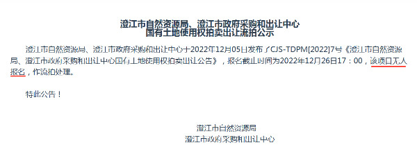 近日,澄江自然資源局發布公告稱,截止12月26日,融創蔚藍城被收回后又重新上架拍賣的CTC(2018)34-1號商業地塊因無人報名,已做流拍處理。