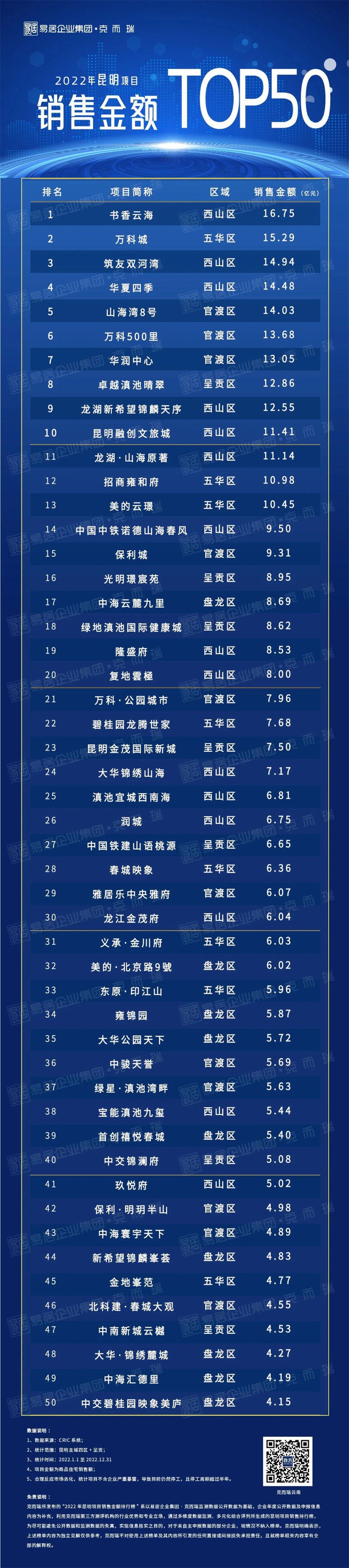 與2021年克而瑞發(fā)布的昆明項目銷售金額排行榜比起來,前十強(qiáng)中的書香云海、筑友雙河灣、卓越滇池晴翠、錦粼天序上榜,取代前一年的俊發(fā)城、彩云城、觀云海、萬科公園城市。