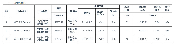 此次上架的3宗土地編號為ANCB-2022T029-A1、ANCB-2022T030-A1和ANCB-2022T030-A2號,均為城鎮住宅用地性質,總面積約189.63畝,容積率1.5-2,最大可建面約21萬方,交易起拍價為3.64億元,初始樓面價為1440-1920元/平,地價約192萬元/畝。