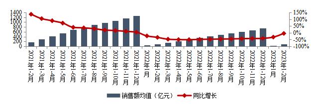 圖:2021年至2023年1-2月TOP100房企累計銷售額及增速情況