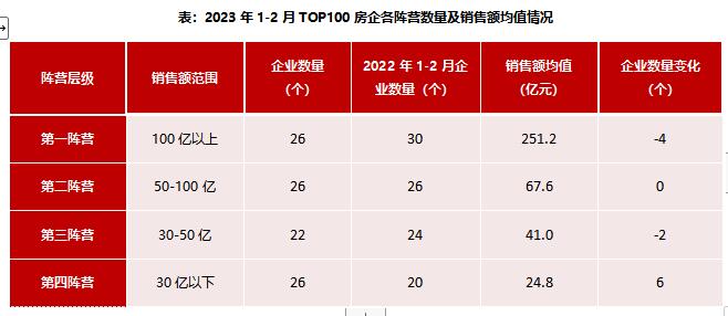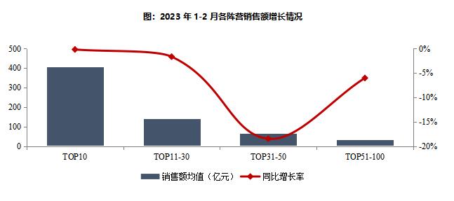 2023年1-2月,第四陣營企業數量增加。具體來看,百億以上陣營26家,較去年同期減少4家,為四個陣營中數量減少最多陣營,銷售額均值251.2億元。第二陣營(50-100億)企業26家,較去年同期持平,銷售額均值67.6億元。第三陣營(30-50億)企業22家,較去年同期減少2家,銷售額均值41.0億元。第四陣營(30億以下)企業為26家,較去年同期增加6家,銷售額均值24.8億元。