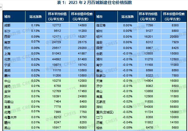2023年2月,新建住宅價格環(huán)比上漲城市個數(shù)為26個,較上月增加14個。具體來看,成都、長沙新建住宅價格環(huán)比分別上漲0.19%和0.13%;西安、南京、杭州緊隨其后,新房價格環(huán)比漲幅均在0.05%-0.10%之間;上海、北京等21個城市新建住宅價格環(huán)比漲幅均在0.05%以內(nèi),其中上海環(huán)比漲幅較大,為0.03%。2月,蘭州、常熟等29個城市環(huán)比持平。