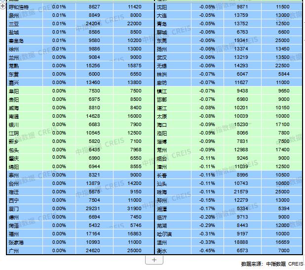 中指研究院報道:根據(jù)中國房地產(chǎn)指數(shù)系統(tǒng)百城價格指數(shù)[ 中國房地產(chǎn)指數(shù)系統(tǒng)百城價格指數(shù)編制規(guī)則詳見附錄。]對全國100個城市新建、二手住宅銷售市場及50個城市租賃市場的調(diào)查數(shù)據(jù),2023年2月,全國100個城市新建住宅平均價格為16174元/平方米,環(huán)比由下跌0.02%轉(zhuǎn)為持平。從漲跌城市個數(shù)看,26個城市環(huán)比上漲,45個城市環(huán)比下跌,29個城市持平。同比來看,全國100個城市新建住宅平均價格較去年同期下跌0.06%。全國100個城市二手住宅平均價格為15856元/平方米,環(huán)比下跌0.01%,跌幅較上月收窄0.10個百分點。從漲跌城市個數(shù)看,31個城市環(huán)比上漲,68個城市環(huán)比下跌,1個城市持平。同比來看,全國100個城市二手住宅平均價格較去年同期下跌0.96%,跌幅較上月擴大0.15個百分點。全國50個城市住宅平均租金為36.7元/平方米/月,環(huán)比上漲0.27%,環(huán)比止跌轉(zhuǎn)漲,上月為下跌0.27%。從漲跌城市個數(shù)看,33個城市環(huán)比上漲,17個城市環(huán)比下跌。同比來看,全國50個城市住宅平均租金較去年同期下跌1.53%,跌幅較上月收窄0.44個百分點。