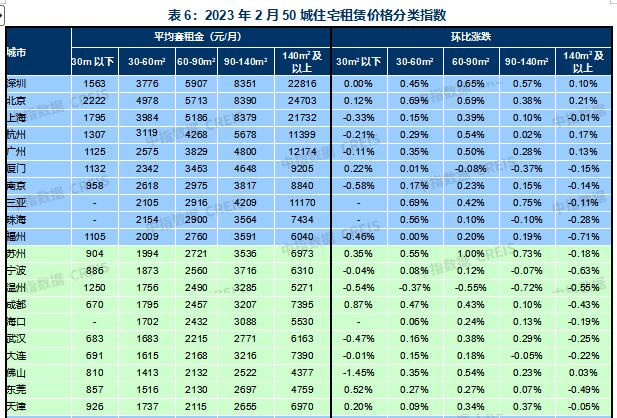 2023年2月,全國50個城市住宅平均租金為36.7元/平方米/月,環(huán)比上漲0.27%,同比下跌1.53%。