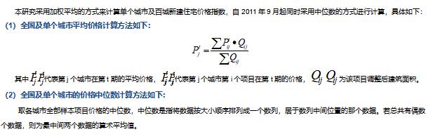 (4)樣本權(quán)重:若項目土地使用證注明為單一物業(yè)類型或某類物業(yè)占項目總建筑面積超過80%且其他物業(yè)總面積不符合成為單一樣本的規(guī)模要求,將該項目作為該類物業(yè)的樣本項目,項目總建筑面積即為該類物業(yè)的建筑面積;若項目包括多種物業(yè)形態(tài)且各類物業(yè)的建筑面積符合相關(guān)標(biāo)準(zhǔn),將其拆分為不同的項目。為了避免單個項目對價格計算結(jié)果產(chǎn)生過大影響,根據(jù)其總規(guī)模和單價、結(jié)合市場實際情況對其建筑面積進行拆分,將拆分后的建筑面積作為該項目的權(quán)重。2012年12月起,采用新的規(guī)則確定項目權(quán)重并對歷史價格進行修正,結(jié)合樣本價格檔次確定項目年消化時間,計算其年均消化面積,作為該項目的權(quán)重,詳見《關(guān)于“百城新建住宅價格指數(shù)”改進的說明》。