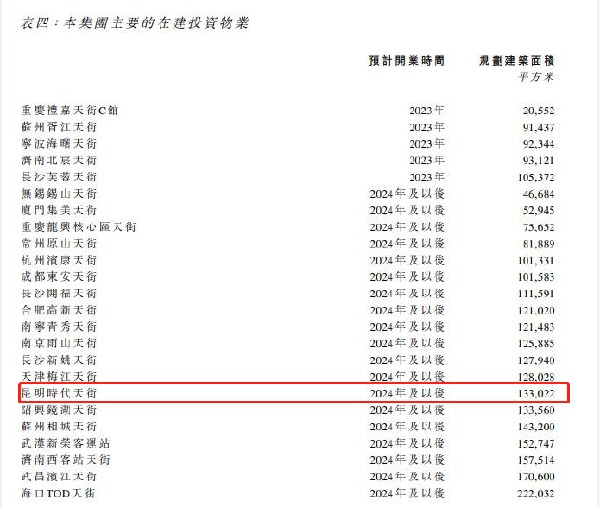上周五,龍湖集團(tuán)發(fā)布的2022年度業(yè)績(jī)報(bào)告透露了國(guó)內(nèi)在建天街項(xiàng)目的營(yíng)業(yè)計(jì)劃。讓人意外的是,昆明龍湖時(shí)代天街廣場(chǎng)的開業(yè)時(shí)間被定在了2024年及以后。雖然具體時(shí)間還未定,不過可以確定的是,原今年三季度開業(yè)的計(jì)劃應(yīng)該是泡湯了。