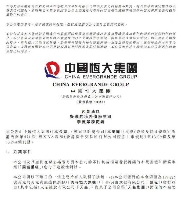 恒大3月22日發布公告,其與境外債權人小組已簽署重組方案的主要條款,包括將發行新的債券對原債券進行置換;新債券年限4至12年、年息2%至7.5%;前三年不付息,第四年初開始付息、付本金的0.5%。