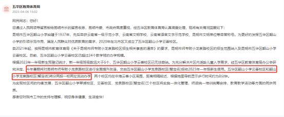 日前,有網友在人民網地方領導留言板上反映韶山小學云著校區學生的就讀問題。五華區教育體育局在4月6日的回復中提到,今年暑期將對昆明市師專附小龍泉路校區進行全面提升改造,交由五華區韶山小學龍泉路校區(暫定名)招收2023年一年級新生使用。五華區韶山小學云著校區和韶山小學龍泉路校區(暫定名)將分兩段一校兩址流動辦學。