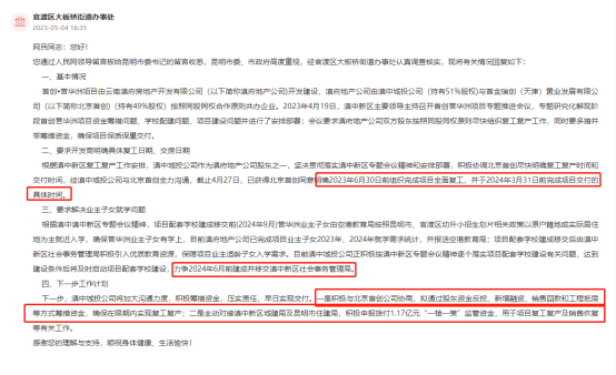 在下一步的工作計劃方面,滇中城投公司積極與北京首創公司協商,擬通過股東資金反投、新增融資、銷售回款和工程抵房等方式籌措資金,確保在限期內實現復工復產;二是主動對接滇中新區城建局及昆明市住建局,積極申報撥付1.17億元“一樓一策”監管資金,用于項目復工復產及銷售恢復等有關工作。