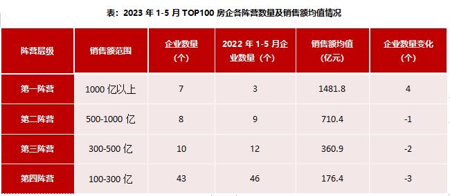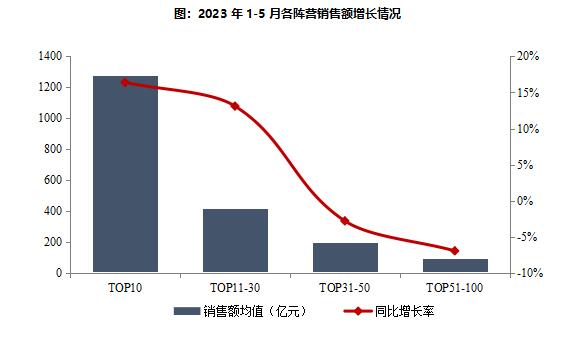 2023年1-5月,千億以上陣營企業數量增加。具體來看,千億以上陣營7家,較去年同期增加4家,銷售額均值1481.8億元。第二陣營(500-1000億)企業8家,較去年同期減少1家,銷售額均值710.4億元。第三陣營(300-500億)企業10家,較去年同期減少2家,銷售額均值360.9億元。第四陣營(100-300億)企業為43家,較去年同期減少3家,銷售額均值176.4億元。