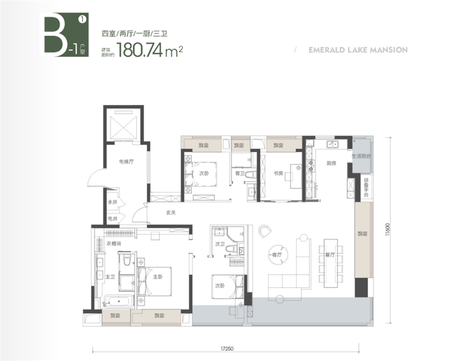 然后是建筑面積約180平方米的住宅戶型,與建面約140平的戶型相比多了一個衛(wèi)生間的設計,整體空間設計也更為闊綽。