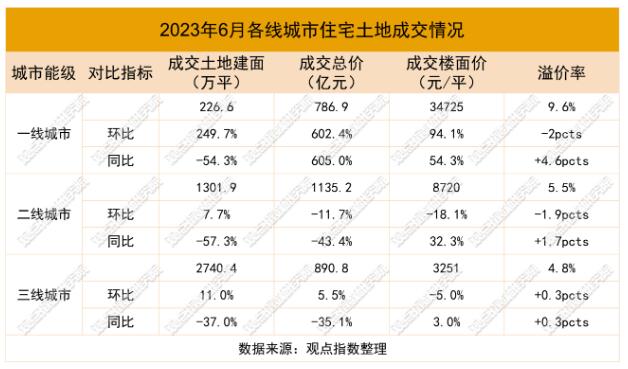 住宅用地方面,一二三線城市成交住宅用地684宗,成交土地規(guī)劃建筑面積4229萬平方米,環(huán)比上升13%,同比下降46.4%;成交總價2726億元,環(huán)比上升21.6%,同比下降39.4%;成交樓面均價6447元/平方米,環(huán)比上升7.6%,同比上升13.1%;平均溢價率6.44%。