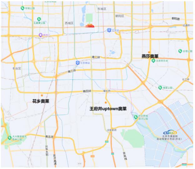 以近期的王府井uptown奧萊項目為例,從區位條件來看,項目所處的南部區域,有著花鄉奧萊、燕莎奧萊等同類型奧萊項目。雖然三者分屬大興區、豐臺區、朝陽區,但就奧萊業態布局而言,相互之間的距離并不算遠。