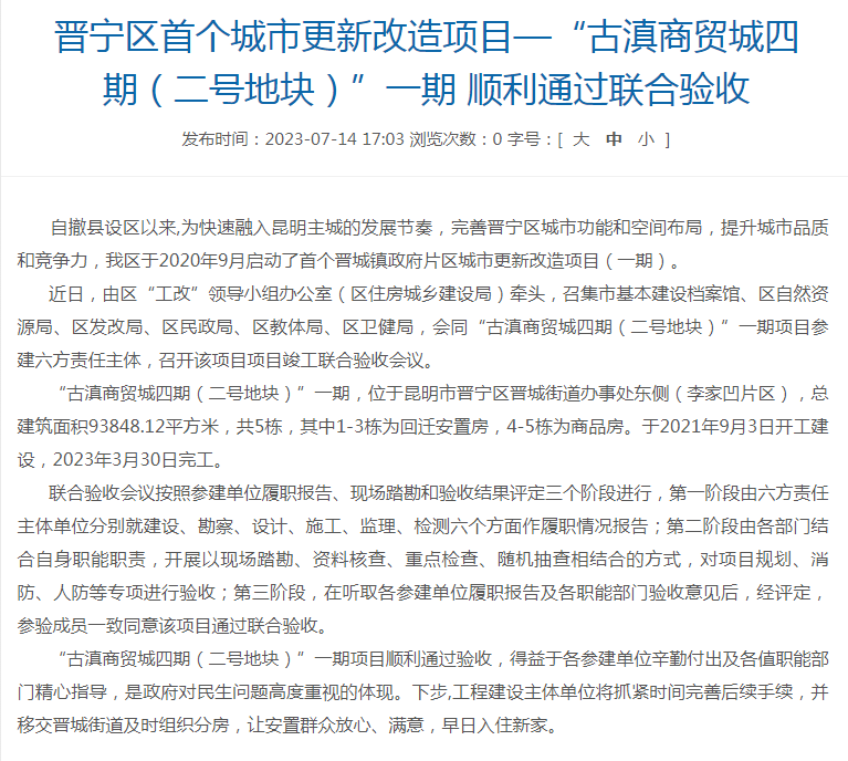 前段時間,晉寧區政府網站發布了一則公告,說晉寧區首個城市更新改造項目—“古滇商貿城四期(二號地塊)”一期已經順利通過聯合驗收。