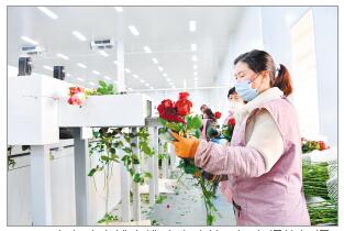 工人在流水線上挑選玫瑰花。記者楊艷輝攝