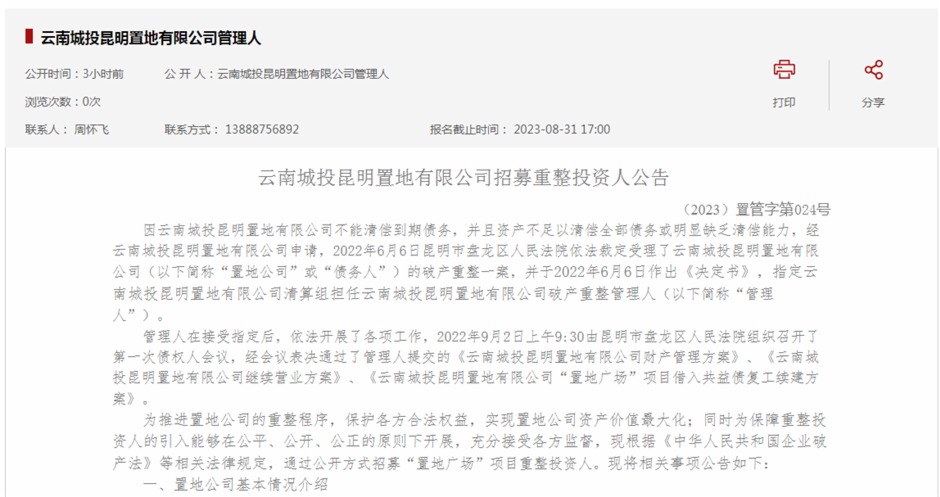 7月31日,云南城投昆明置地有限公司管理人正式發布了招募重整投資人公告。
