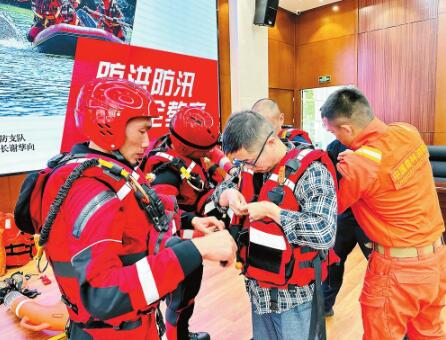 8月10日,昆明市防汛抗旱辦公室聯合省森林消防總隊特勤大隊以及昆明市交警、教體、氣象、水文等部門,在市防汛指揮中心舉辦防汛安全知識培訓,向防汛一線工作人員和市民群眾科普汛期安全、防洪避災知識,提升汛期災害防御應對處置能力,增強市民群眾的安全防范意識。圖為消防員介紹防洪排澇中的防護措施。