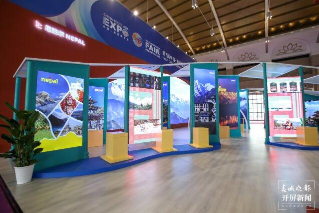 據云南駿宇國際文化博覽股份有限公司策展人白思雨介紹,主題國尼泊爾國家形象展區面積600平方米,在整個形象展區設計中,主要體現出了“雪山下的王國”這一主題。記者看到,展區以尼泊爾特色建筑中的赭紅色為主色,將紐瓦利建筑風格運用到展臺設計中,并運用了立體多層的藝術手法展示尼泊爾特色地標建筑,山脈造型的隔柵,凸顯出了尼泊爾綿延起伏的山脈。“在尼泊爾國家形象展區中,還運用了多媒體技術全面展示尼泊爾的人文風情、自然風光、文化遺產等的獨特魅力。”白思雨說。