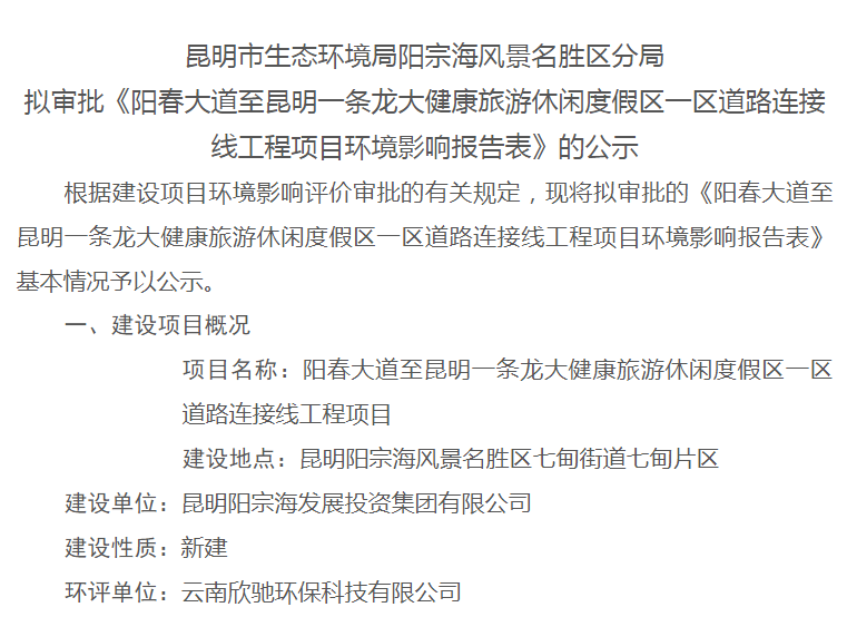 近日,昆明陽宗海風景名勝區官網發布了擬審批《陽春大道至昆明一條龍大健康旅游休閑度假區一區道路連接線工程項目環境影響報告表》的公示。