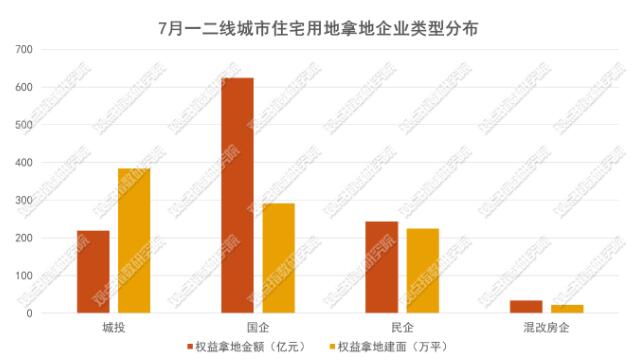 觀點指數統計7月一二線城市住宅用地競得企業類型發現,本月國企拿地依然位居前列,從權益拿地金額來看,報告期內城投、國企、民企和混改房企的占比分別為19.5%、55.8%、21.7%和3%。