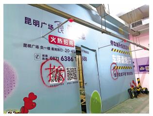 趙先生說,同德昆明廣場的地下商業(yè)部分與小區(qū)A區(qū)地下停車場是連通的,在車位上修建筑,很可能之后要作為商鋪出租。“之前就有一些停車位被他們修成了倉庫,用來出租。”記者看到,現(xiàn)場部分圍合起來的區(qū)域墻體上,確實(shí)打著寫有“昆明廣場食尚匯火熱招商”等字樣的廣告。