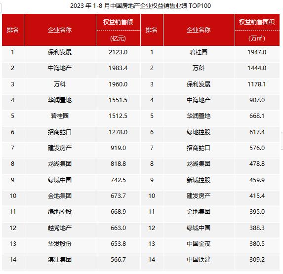 特別聲明:房地產企業銷售數據統計是以2023年1月1日-8月31日期間銷售的并表商品房為統計口徑,主要依據CREIS中指數據在各地的銷售監測數據,并參考當期總體經營情況和推盤去化情況進行分析統計;對于少數沒有在監測范圍內的城市或項目,由企業提供相關證明文件,經課題組對數據進行嚴格審核,也納入統計范圍。本報告僅供參考,課題組不對使用報告及其內容所引發的任何直接或間接損失承擔責任。