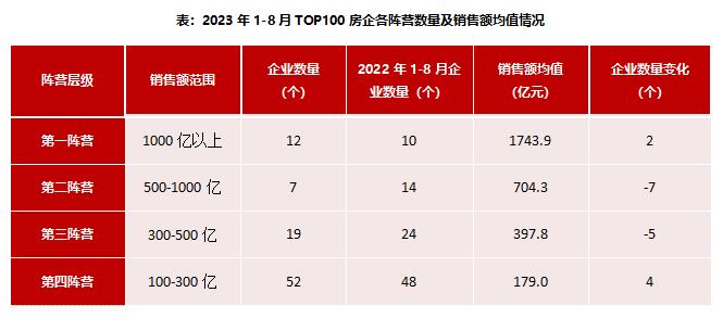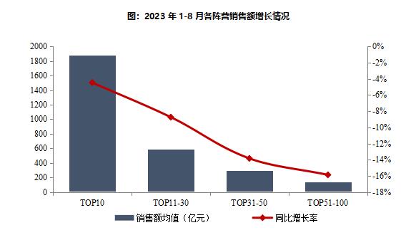 2023年1-8月,百億以上陣營企業數量減少。具體來看,千億以上陣營12家,較去年同期增加2家,銷售額均值1743.9億元。第二陣營(500-1000億)企業7家,較去年同期減少7家,銷售額均值704.3億元。第三陣營(300-500億)企業19家,較去年同期減少5家,銷售額均值397.8億元。第四陣營(100-300億)企業為52家,較去年同期增加4家,銷售額均值179.0億元。