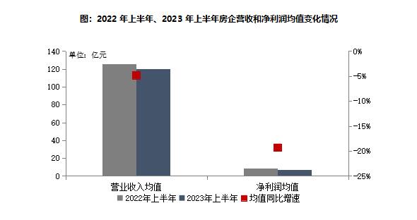 截至2023年8月30日,已有97家A+H股房企發布2023年半年報或中期業績公告。根據中指研究院監測數據顯示,97家A+H股房企營業收入均值同比下降1.3%,凈利潤均值扭虧為盈,其主要受恒大虧損額減少影響,剔除恒大后的營業收入均值為119.9億元,同比下降4.8%,凈利潤均值為7.2億元,同比下降19.3%。其中,50家企業營收同比下降,68家企業凈利潤同比下降,行業整體盈利性持續走弱。