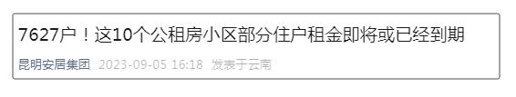 9月5日,昆明安居集團(tuán)發(fā)布信息:今年9月份,子君村,澤惠園等10個(gè)公租房小區(qū)的7627戶住戶租金即將或已經(jīng)到期,提醒廣大租戶按時(shí)繳費(fèi),避免違約。