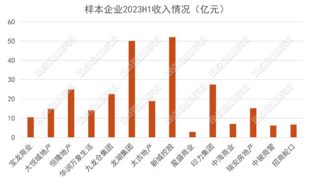 期內,大部分商業地產企業公布了上半年的業績,樣本企業中,新城控股和龍湖集團的收入均超過50億元,主要得益于可觀的項目規模帶來的整體效益。