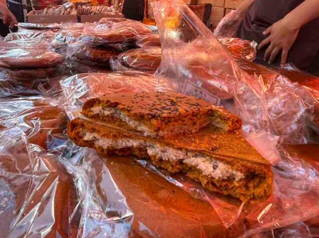 “我要10個大餅,3個白糖、2個蘇子、2個胡麻、3個火腿。”在呂紹奎的攤位前,消費者馬女士告訴記者,傳統手工大餅能吃到童年的味道,記得小時候奶奶得做的餅就有這個味。