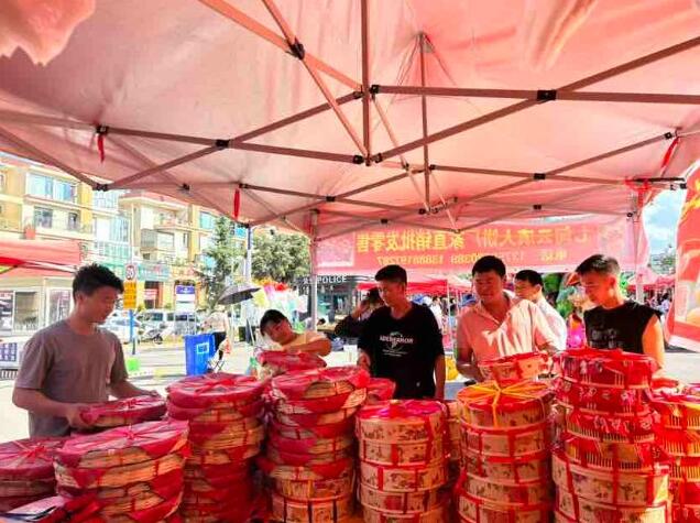 9月24日下午3點多,在昆明市呈貢區林溪路茶天下云茶城門口的集貿市場,一家出售傳統手工七甸大餅的攤位前圍滿了消費者,該商家的月餅用竹編的簸箕裝起來,盡顯傳統特色,購買者絡繹不絕,老板呂紹奎和兒子則忙得滿頭大汗。