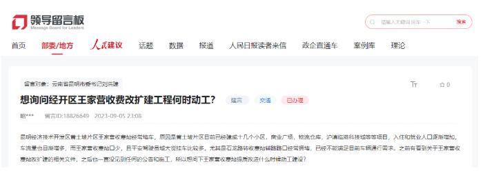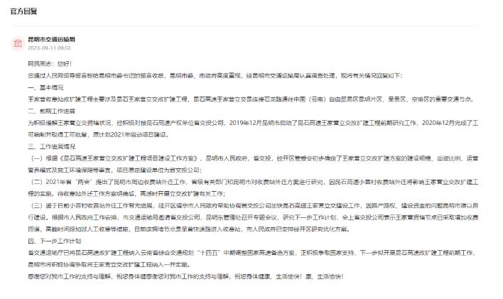 近日,針對網友在人民網領導留言板上關于“經開區王家營收費改擴建工程何時動工”的留言,昆明市交通運輸局進行了回復。