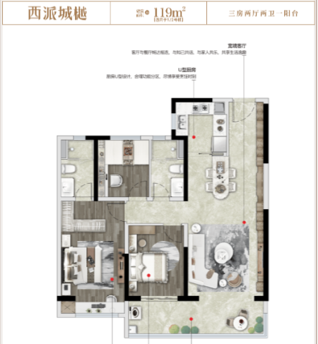 建筑面積約119平方米的戶(hù)型,為三房?jī)蓮d兩衛(wèi)一陽(yáng)臺(tái)設(shè)計(jì)。該戶(hù)型采用了目前市場(chǎng)上比較流行的餐客廳與陽(yáng)臺(tái)一體化的設(shè)計(jì),室內(nèi)空間感十足;三個(gè)臥室形成的休息區(qū)與餐客廳構(gòu)成的活動(dòng)區(qū)有明顯區(qū)隔,分區(qū)明確;主臥套房設(shè)計(jì),帶獨(dú)立衛(wèi)浴及飄窗,私密且舒適。
