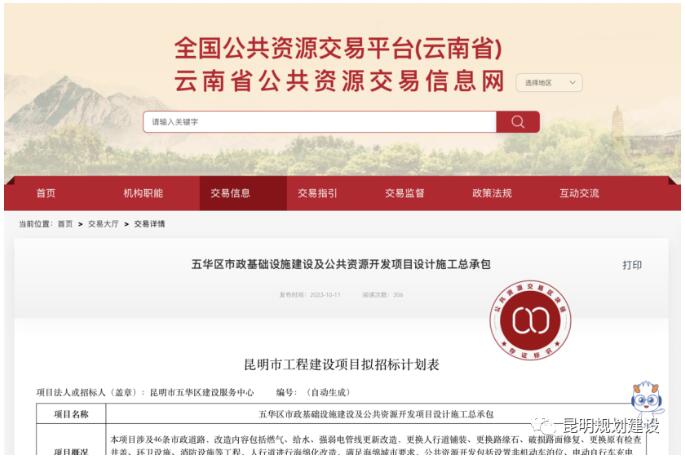 10月12日,云南省公共資源交易信息網發布了五華區市政基礎設施建設及公共資源開發項目設計施工總承包招標公告,圍繞項目的設計、施工等工作進行招標。